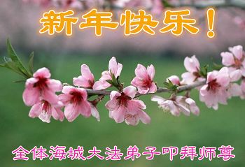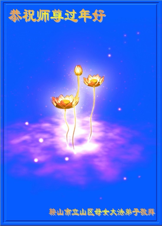 慈悲伟大的师尊: 过年好!师父辛苦了! 值此新春佳节之际,请接受全体海城大法弟子的无限感恩与敬意,恭祝师尊新年快乐! 在正法最后的有限时间里,我们会更加努力的做好三件事,整体配合好,救度更多的有缘众生的同时,学好法修好自己精進实修,达到新宇宙的标准要求。让师尊多一些欣慰,少一些操劳是我们的心愿。跟上师父正法進程!全体海城大法弟子叩拜师尊!再次感恩师尊的无量慈悲! 辽宁省鞍山大法弟子向伟大的师尊拜年!