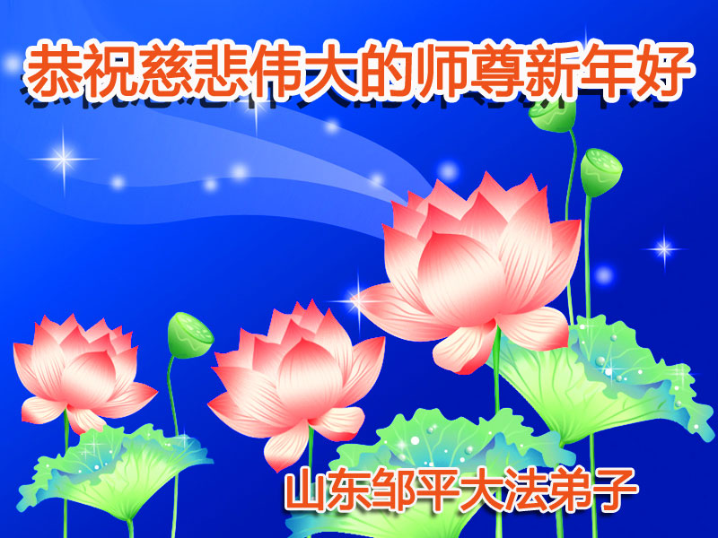 师父好! 正法又一年。弟子在修炼当中,悟性差。在遇到去执着心的时候,人心强没有及时的站在法上找自己,让师父操很多的心。真是对不起师父。今后在师父和大法的鼓励和加持正念,呵护下做好三件事。谢谢师父的慈悲苦度。 我代表被非法关押在狱中的丈夫同修向师父问新年好! 山东省潍坊市高密市大法弟子携全家恭祝慈悲伟大的师尊新年快乐!
