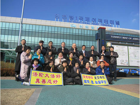 在韩国仁川码头讲真相救人的大法弟子们恭祝慈悲伟大的师尊过年好!