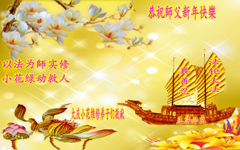慈悲伟大的师尊:新年好! 能够随师下世,在正法时期成为大法徒,助师正法,是我们及所代表生命的荣耀。 师尊,这里您的每一位弟子都非常精進,在您的慈悲呵护下,我们都坚定的走在助师正法的路上。 我们中的一些同修虽然没有文化,但是每个弟子都有在随师正法中殊胜的感受,都有千言万语想对师父表达,所以大家就想把自己最想对师父说的话当作给师尊新年的问候。同修们非常珍惜这次机会。想起师父对自己的慈悲苦度,每个人都很感动,有的掉下了眼泪,有的泣不成声。 下面是同修的记录,每个同修都说了自己最想说的一句话,整个过程大家都感受到,师父就在我们身边。 弟子梁子:祝师尊过年快乐,师父辛苦了!感谢师尊的慈悲苦度! 弟子张姨:祝师父正法早日成功! 弟子何姨:谢谢师父慈悲苦度,千言万语都是感谢师父。 弟子张姐:师父弟子想念您,盼望师父早日回国。 弟子于姨:千言万语汇成一句话:谢谢师父! 弟子张叔:谢谢师父给的第二次生命,感谢师父救度之恩!祝师尊过年快乐! 弟子小张:谢谢师父,让我明白了人生的真正意义。谢谢师父,让我这个迷失在尘世中的生命找到了回家的路。祝师尊新年快乐! 弟子春华:感谢师尊给予我新的生命,我的脱胎换骨融入着师尊无数的心血与慈悲苦度,弟子无以回报只有精進。跪拜师尊新年快乐! 弟子孙姨:感谢师父的慈悲救度,千言万语都表达不了。 请师父放心,我们将按照对正法时期大法弟子的要求,精進实修,做好三件事,走好最后的路! 再次祝师尊新年快乐!! 黑龙江大庆一学法小组全体大法弟子 黑龙江省大庆大法弟子给师父拜年!