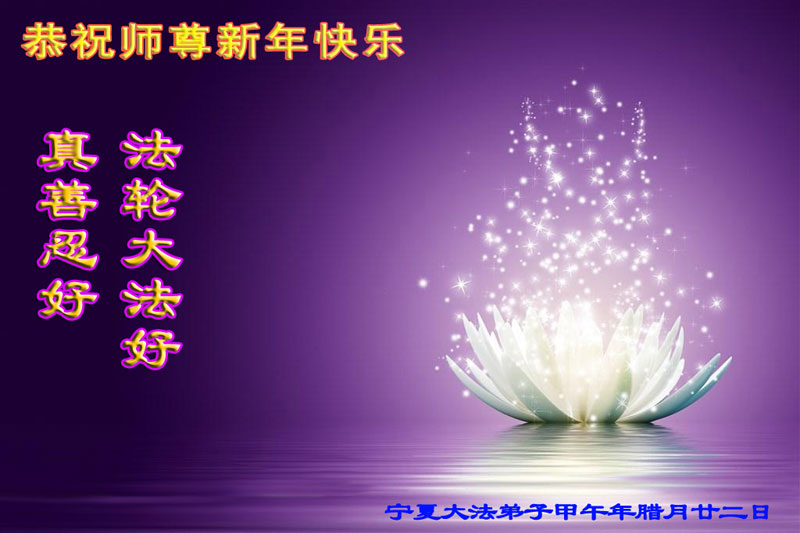 十九年的修炼,感念师尊的洪天之恩,自愧自恨不能始终若一的保持精進状态。以后,弟子要加紧学法、背法,加紧修去色欲、懒惰、好面子、怕、显示及各种情等人心,从自我中摆脱出来,慈悲的对待众生,在面对面讲真相、劝三:退.上要突破自己,踏踏实实做好“三件事”,让师尊少为弟子操一份心。 叩拜师尊:过年好! 宁夏全体大法弟子恭祝师尊过年好!