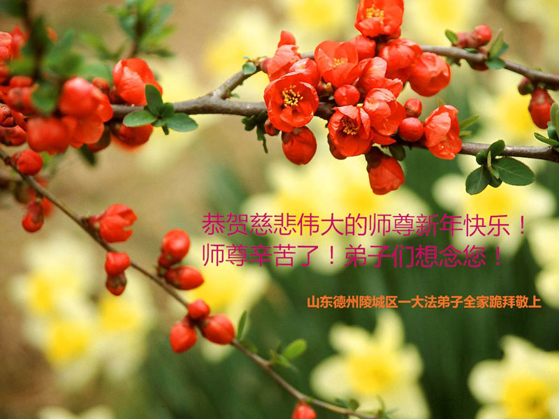 冬去春来邪恶除,世间巨变正法临,百花报春瑞意浓,同贺师尊天地春。 值此佳节来临,我代表陵城区全体大法弟子恭祝慈悲伟大的师尊新年快乐!万事如意!我们全家给慈悲伟大的师尊拜年!恭祝慈悲伟大的师尊新年快乐!万事如意! 大法弟子敬上 山东省德州市武城县大法弟子恭祝师尊新年快乐!