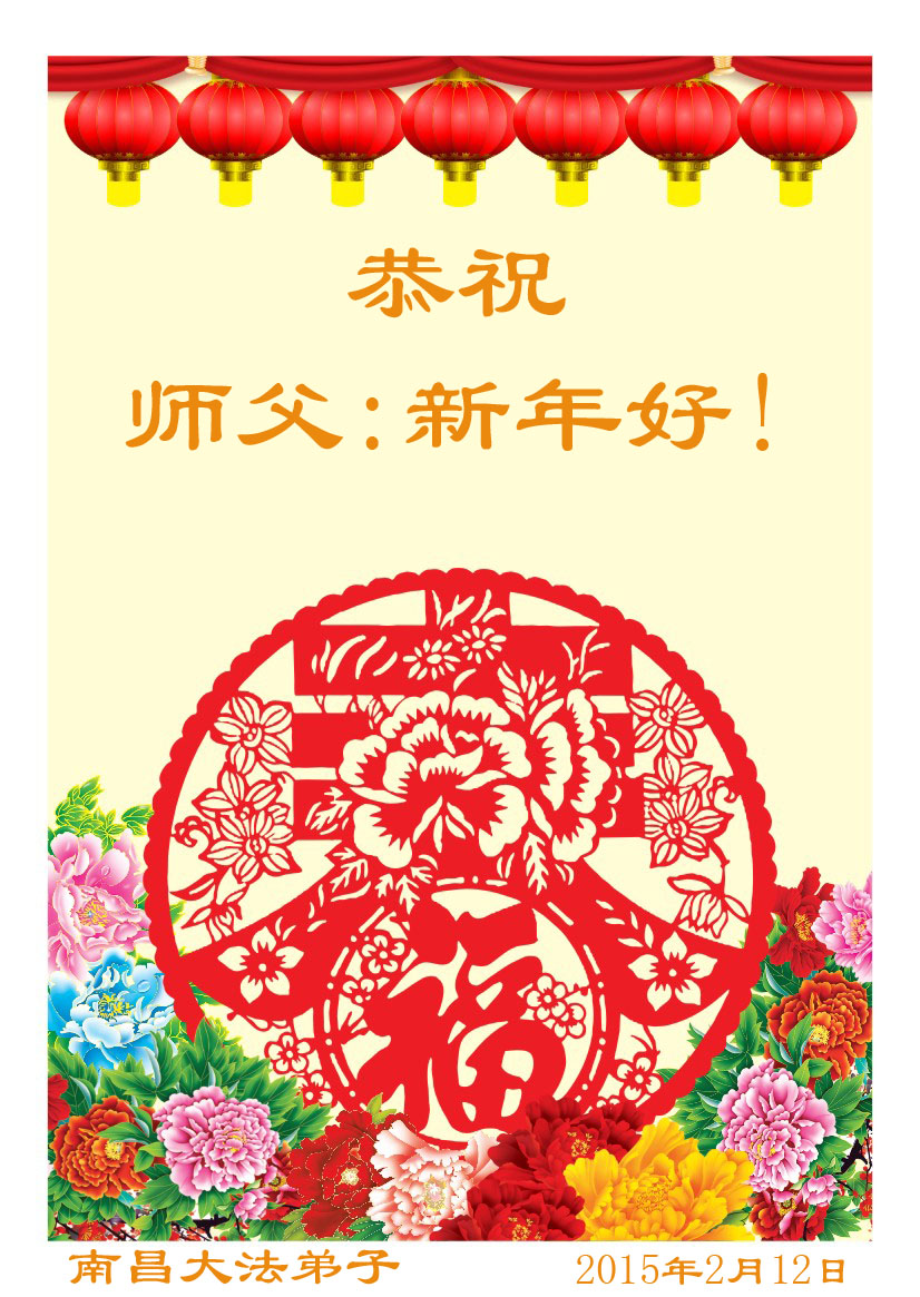 江西南昌县一学法小组全体大法弟子向慈悲伟大的师尊问好!祝师尊新年快乐! 我们坚修大法紧随师尊,学好法,做好三件事,精進随师返回家园。 南昌县一学法小组全体大法弟子 二零一五年二月十一日 江西鄱阳县新老大法弟子齐祝愿:慈悲伟大的师尊新年快乐!