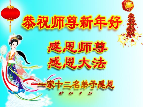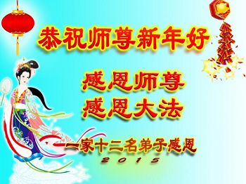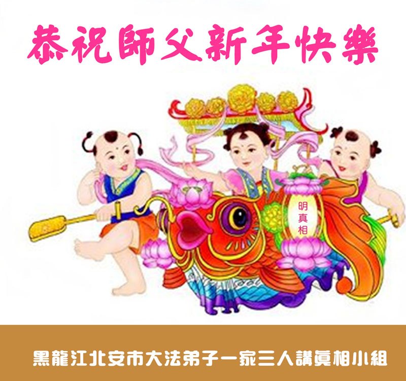 在师尊佛恩浩荡的普照下,我们迎来了2015年的新年,在此,我们全体大法弟子向师尊拜年!恭祝师父新年好! 我们全体大法弟子日夜想念您!在新的一年里,我们弟子唯有再精進实修,做好“三件事”多救众生。全体大法弟子早日与师尊相见,这是我们的心愿! 黑龙江省黑河市北安市大法弟子一家三人讲真相小组恭祝尊敬的师父新年快乐!