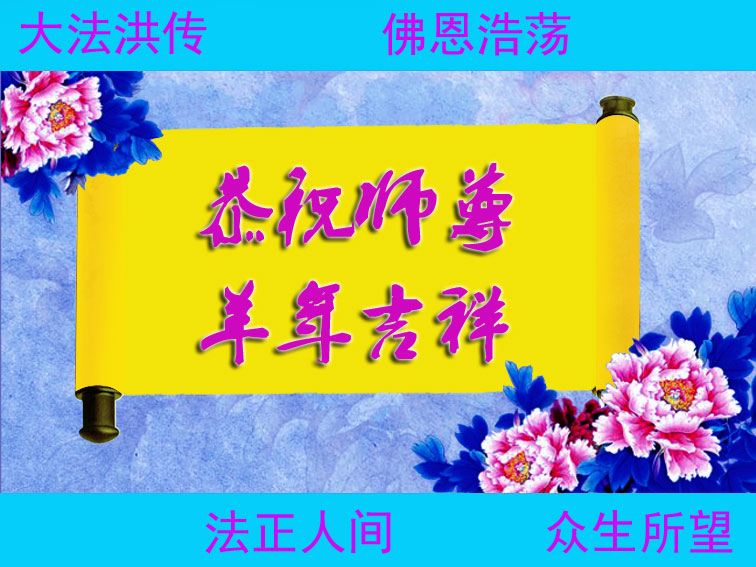 乙未年前夕,回想走过的二十年修炼路,全靠恩师导航,大法指路!只有以法为师,善用法宝,真正自然内找,紧抓时空机缘,脚踏实地,三件事中提高心性,兑现誓约,成就使命,真正修到无执无漏恩师安排的高境界。在此,借用人中兄长同修的诗,代全家老(93岁)、小(双胞胎8岁)十二位同门大法弟子向恩师叩拜!恭贺新年!也向恩师道一声:师尊,您辛苦了!我们向您发誓:听您的话,真正做到,跟您走! 春回人间 踏实学法道我晓 实修心性圆容好 修执无漏把好道 众生救度抓紧牢 正念纯足最重要 红魔烧尽金刚佼 三羊开泰迎春到 辽宁鞍山立山一学法小组大法弟子恭贺师尊新年好!