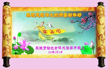 值此2015年新年来临之际,我们感恩师尊的慈悲救度,弟子只有用努力做好三件事,在日常的工作、生活中真修、实修报答师尊,兑现誓约,圆满随师回家。 黑龙江省哈尔滨市双城区车站街全体大法弟子恭祝慈悲伟大的师尊过年好!