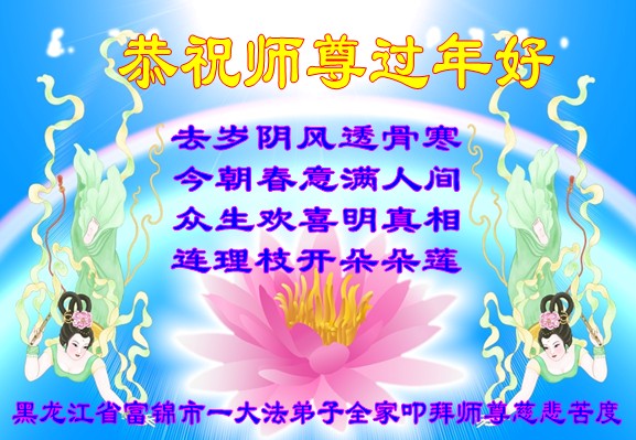 尊敬的师尊: 您好! 在新的一年,弟子更加精進,多学法,做好三件事,随师还。 祝师尊新年快乐! 佳木斯大法弟子一家四口 黑龙江省佳木斯大法弟子恭祝师尊新年快乐!