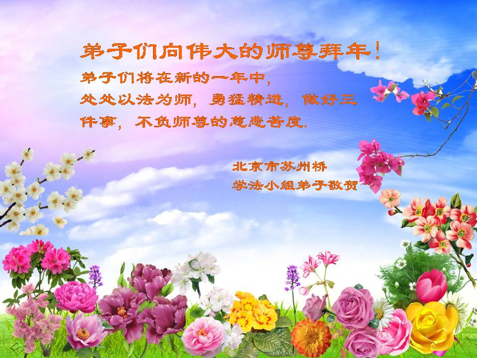 弟子们祝师尊新年快乐! 弟子们在新的一年里,一定处处以法为师, 勇猛精進, 做好三件事, 不负师尊的慈悲苦度。 北京市苏州桥学法小组弟子叩拜 北京丰台区大法弟子祝师尊新年快乐!