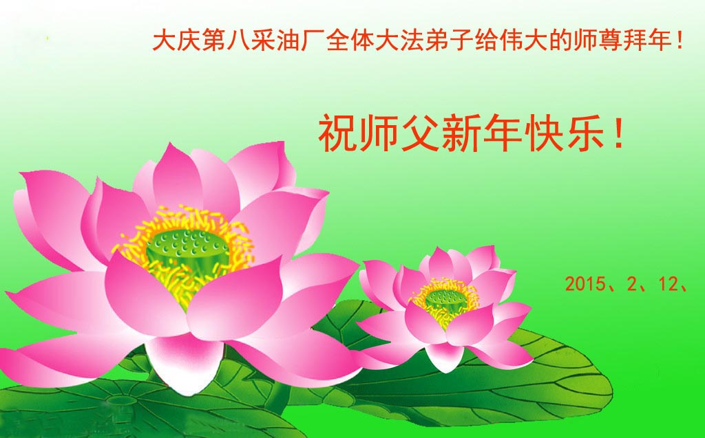 慈悲伟大的师尊过年好!感恩师尊慈悲苦度。 弟子深知自己修的不好,在正法最后的最后,自身还有很多的执着心。我知道愧对师尊的慈悲苦度。在新的一年里,我要牢牢把握好这万股机缘,精進实修,努力做好三件事,多救人,修去各种不好的执着心,圆满随师还! 合十! 大庆让胡路区一老年大法弟子叩拜 2015年2月13日 黑龙江省大庆第八采油厂全体大法弟子祝师父新年快乐!