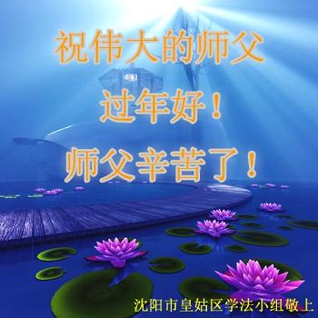 师父您辛苦了!感恩师尊的慈悲苦度! 弟子们在师尊的慈悲呵护下又走过了一年。在这新的一年,弟子们一定多学法,学好法,多救人,做好三件事,精進实修,做一个合格的大法弟子。 请师尊放心!弟子们想念您! 辽宁沈阳一学法小组大法弟子叩拜师尊 合十 辽宁省沈阳大法弟子遥祝师尊过年好!