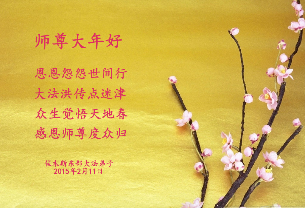 此生为法来, 师尊慈悲怀。 度我出苦海, 法光除阴霾。 学法很认真, 正念神路开。 救人上法船, 三:退.能避灾。 走好最后路, 精進大步迈。 恭祝师尊好, 叩首敬师拜。 佳木斯大法弟子 2015年新年 黑龙江省佳木斯市大法弟子恭祝伟大师尊新年快乐!
