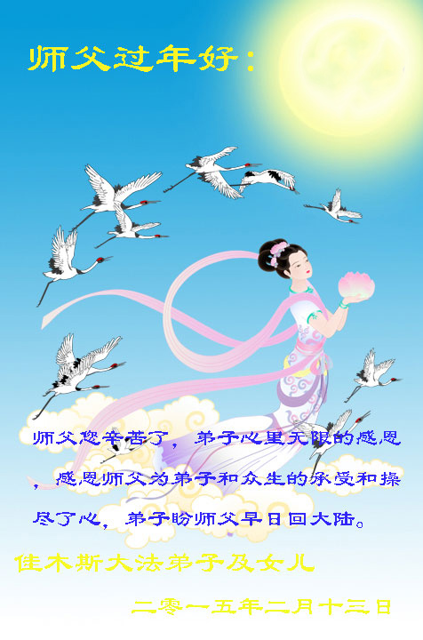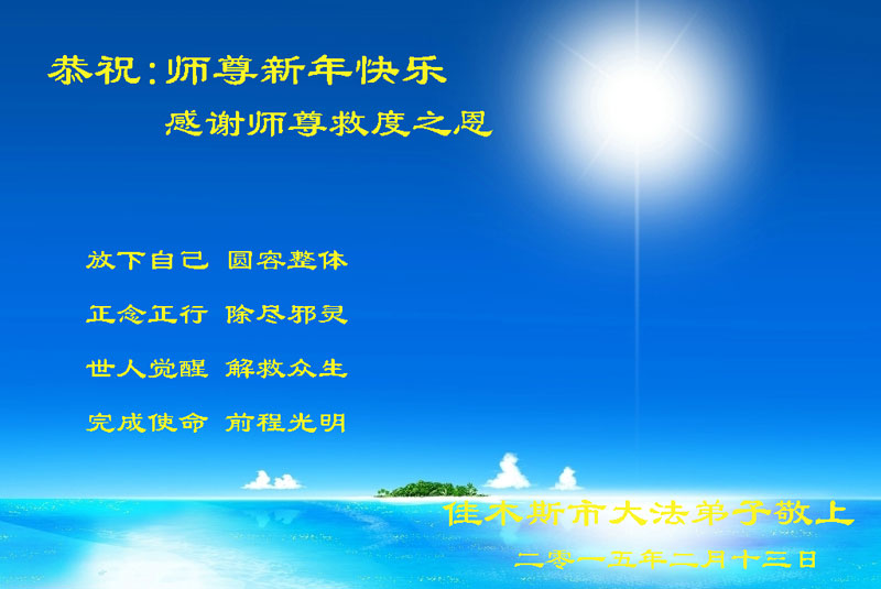 二零一五新年到 恭祝师尊新年好 回想走过修炼路 磕磕绊绊到今朝 承蒙师尊慈看护 千言万语难表述 不记弟子以往过 不辞千辛苦操劳 感恩师尊慈悲度 修炼如初遵师嘱 愿师欣慰开心笑 弟子铭记师恩浩 黑龙江省佳木斯大法弟子恭祝师尊新年快乐!