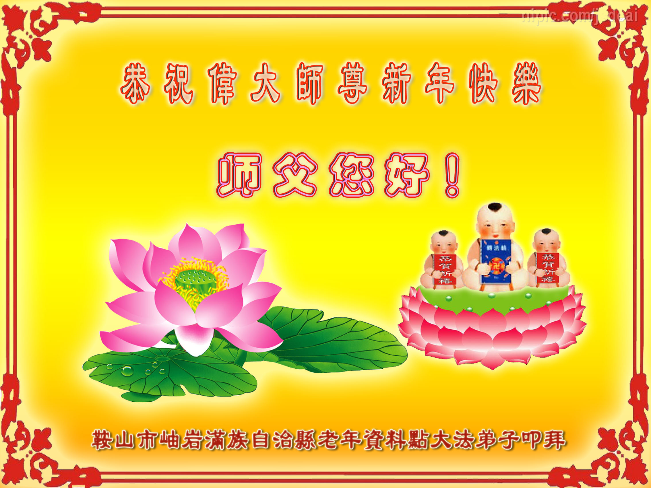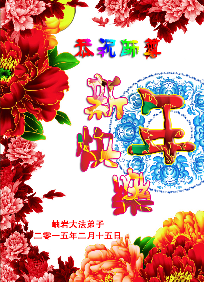 在2015年新年之际,遥望大洋对岸,向恩师三叩首!师父您好!师父您好!师父过年好!让我们同心协力,再接再厉,完成使命!跟师父走。 鞍山市深沟寺六区三个学法小组及全体大法弟子敬上 2015年2月17日 辽宁省抚顺市清原县大法弟子恭祝慈悲伟大的师父新年快乐!