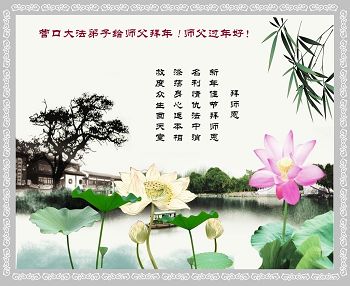 师父:弟子给您拜年了!每逢佳节,总想在网上留下几句祝福师父的话,可总是写不成,因为自己做的太差,每每觉得无颜面对慈悲伟大的师尊。今天,又是一个新年将至,回首自己走过的路,仍是深深惭愧——如此幸运的遇到这万古机缘,却还有那么多不好的心至今不能完全放下,有那么多该做的事,没有用心去做。新的一年,我将尽力! 拜谢师尊! 辽宁一不争气的弟子叩首敬上 辽宁省抚顺市望花大法弟子恭祝师尊过年好!