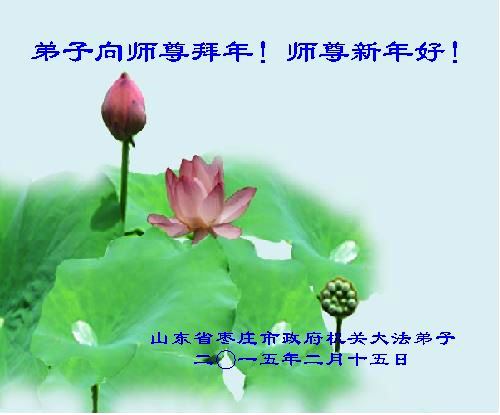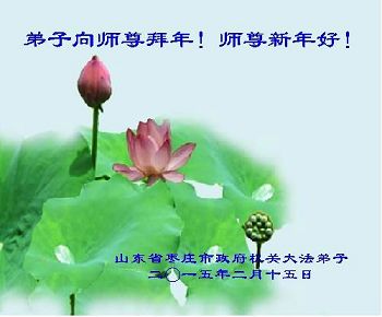 大法弟子被迫害的十几年来,弟子时刻在想念你,无论修炼的路多么坎坷,我们都会以往无前,紧随师尊走好正法的每一步,做好三件事,以完成好我们史前的大愿,再一次叩拜师父过年好,万事如意。 2015年2月10日 山东省政府机关退休大法弟子向师父问好!