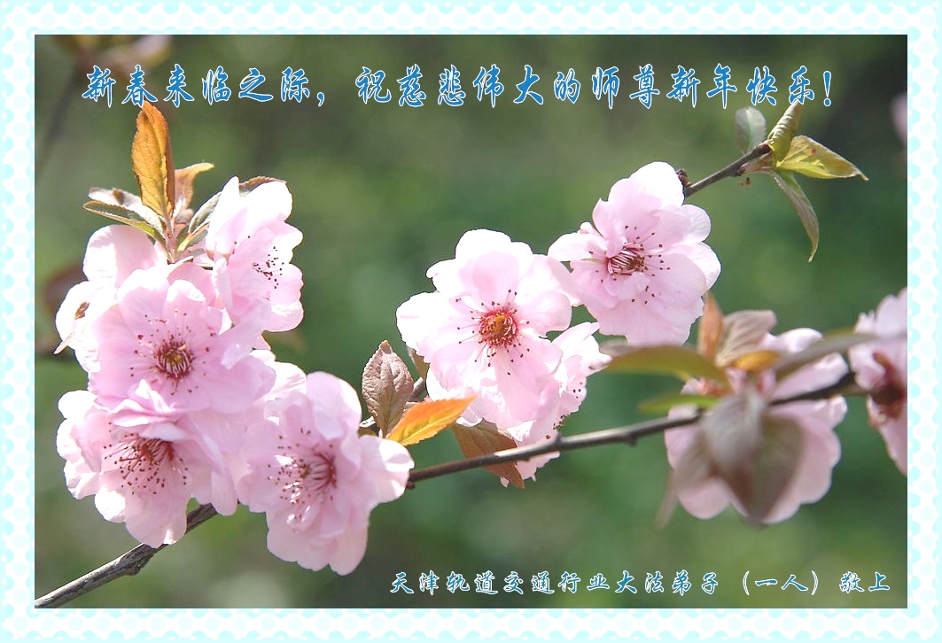 师尊您好,我和84岁母亲是98年得法走入修炼的,21岁的孩子2008年开始修炼,弟子三人有幸成为正法时期大法弟子,在师父的呵护下平稳走到今天。 弟子叩拜师尊,遥祝师尊新年好! 在新的一年里弟子继续做好三件事,多救人,精進实修,不负”正法时期大法弟子“的伟大称号。 天津轨道交通行业一大法弟子祝师尊新年快乐!