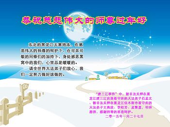 我被不明真相的警察绑架,在师父的保护下,正念走出派出所。在新年到来之际,特意向师父问声好,给师父拜年! 北京海淀区两大法弟子祝师父羊年快乐!