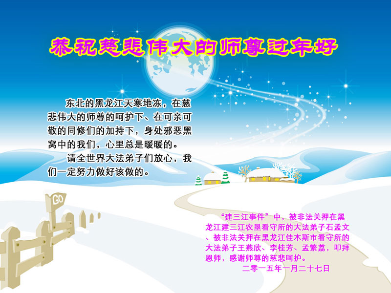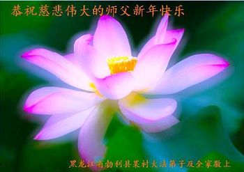 我们农村大法弟子给师尊拜年了!在新的一年中,我们决心更加精進实修,整体提高,整体升华。我们也一定多学法、学好法,不断体悟法理,严格要求,在法上提高自己,尽最大努力叫醒身边昔日的同修,共同努力做好三件事,多救人。请师尊放心,我们一定不辜负师尊的殷切希望,让师尊少操心,使每个人都能走出自己证实法的路,每个人都在整体修炼中共同提高!弟子们给慈悲伟大的师尊叩头,感恩师父!感恩大法! “建三江事件”中仍被非法关押的四位大法弟子恭祝慈悲伟大的师尊过年好!