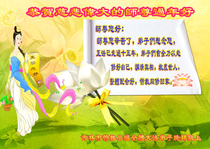 生命为法来,新年谢师尊!在师尊的慈悲呵护下,弟子跟随伟大师尊正法又走过了不凡的一年。在这中国传统新年来临之际,弟子双手合十恭祝远在大洋彼岸的师尊过年好!师尊您辛苦了!弟子想念您!在新的一年里弟子要更加精進实修,做好自己该做的事。多学法、学好法,修好自己多救人,不辜负正法时期大法弟子的光荣称谓。盼望师尊早日回到故乡,神韵在中国大陆上演。弟子跪拜双手合十敬上 被非法关押在吉林监狱的大法弟子恭祝师尊过年好!