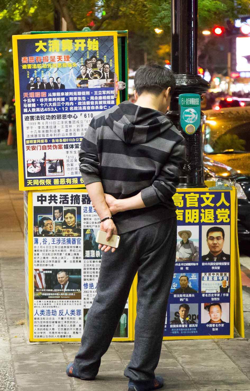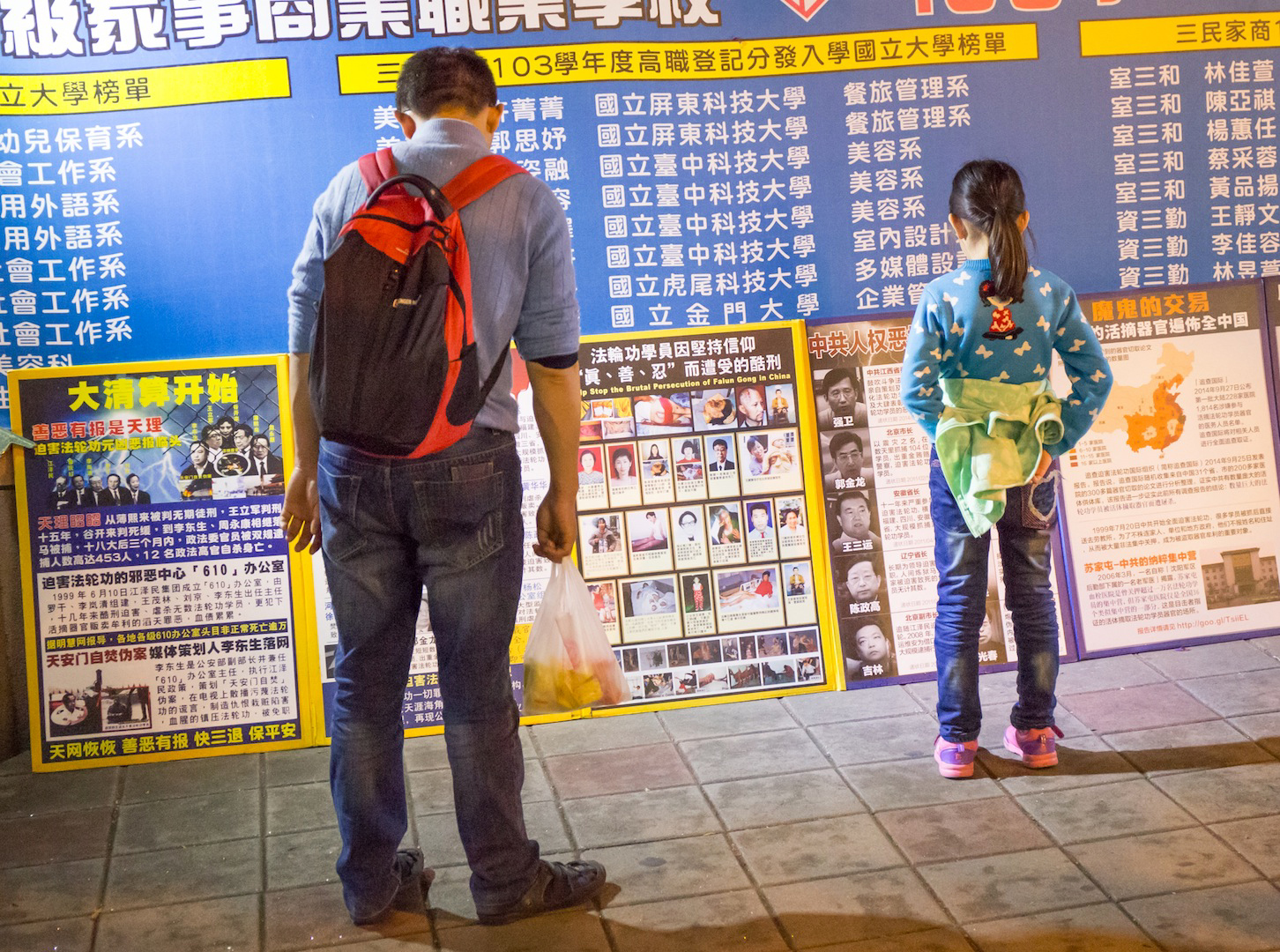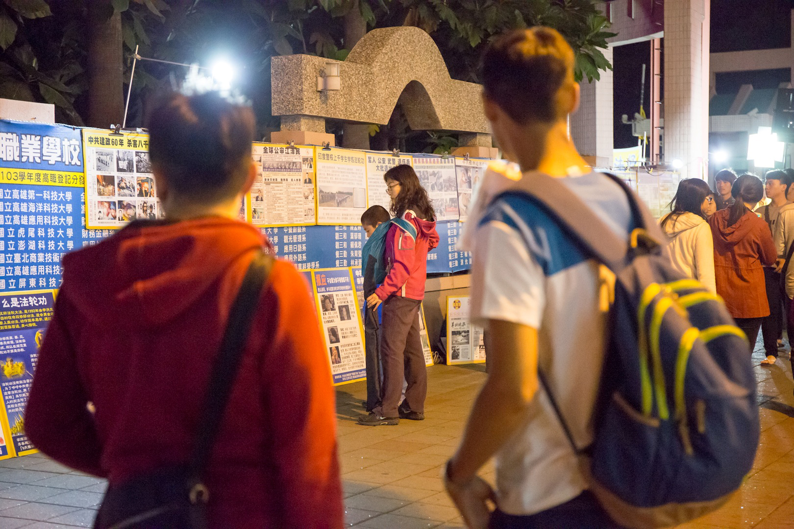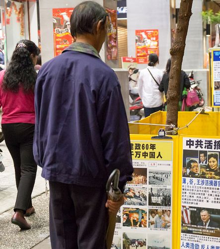 另一位来自辽宁省用“福宜”化名退出共青团的先生说,他来到台湾感到非常震撼,从台湾头到台湾尾都遇到法轮功学员跟他讲真相,在车上他也一直在思考这个问题,他说这些是他之前在大陆完全不知道的真相,在这里他看到法轮功腰鼓队表演的曲子,祥和、有朝气令他感动,他决定在高雄请退!党!志工帮他上网退出共青团。 “法轮功真相点就是我们的集合点” 年初有几车来自华北的大陆游客在瑞丰夜市吃晚餐,领队李先生拿着旗帜,一边看着腰鼓队表演一边在收人,他说:“我们上一站是阿里山,刚从西子湾来到瑞丰夜市,每一个景点找到法轮功的真相点最明显,是解散和集合的好地方,从来就不会丢人。”这个领队说:“这些法轮功真相台湾到处都有,我看了好多次了,每到一个地方我有仔细观察法轮功学员的言行,跟中国大陆讲的不一样。” 李先生也鼓励他的团员把握时间看这些展板,因为这些讲得很在理,他们在中国大陆是看不到的,他对团员说:“材料你们爱拿就拿,爱听就听,利用在台湾的时候赶快看、仔细听,不然到海关入关处就会被没收。”他有同学和朋友在大陆也是炼法轮功的,朋友都提醒他到海外风气自由,多多了解,把看到的现况回去跟他们说说。 “原来法轮功是修炼不参与政治” 一位来自辽宁省的杨先生跟他太太、孩子来台湾八日游,他说他们前一站是台南赤崁楼,这一站高雄西子湾和瑞丰夜市,在这里他第一次看到法轮功腰鼓队,非常的震惊,他说:“我经历了中共一次次的运动,在国内信谁都不可靠,谁也不信,只相信自己,今天在这里看到了法轮功展板上面写的那些贪官腐败,这都是真的。”他是党员,本来以为法轮功搞政治,今天在这里观察了一个多小时,他也问了退!党!志工很多问题,解开心中很多疑惑,知道所有的法轮功腰鼓队成员来自各种行业,自由组队而成,每个人面相都很善良,很健康,最后他说:“原来法轮功是不参与政治,对政治不感兴趣,纯粹是想修好自己的一个信仰。” 索要真相资料回旅馆好好看 有一个大陆游客跟退!党!志工索要了一份中国专刊的真相报纸,他看了看之后说帮他退!党!,刚好有人喊他过去吃东西,他就随手把材料放在旁边机车上,后又赶着回来找他的材料,找到时他好高兴说:“这些是大陆看不到的,回旅馆可以仔细看。”说着就把材料很谨慎地放在他的包包里,还跟退!党!志工直说谢谢。 两位来自天津的大陆游客站在对面百货公司前观赏天国乐团演奏良久,又站在真相展板前仔细阅读,他说:“没出国真不知道海外有这么多人学炼法轮功,这一定是不错的功法,在中国很多讯息不可靠,我真是上当了,请帮我们退*团-、退*队-。”