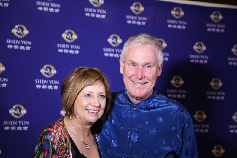 澳大利亚勋章得主、著名的合唱与器乐指挥家海伍德先生(Douglas Heywood)是忠实的神韵迷,今年是第四次观看神韵演出。他说:“我认为今年的晚会制作了更尖端的动态天幕背景,充满了正的能量,色彩壮美。”作为指挥家,海伍德先生对神韵乐团以东、西方乐器合璧演奏的音乐赞誉有加,他说:“中国乐器的五声音阶与西方乐器的大调、小调完美的结合,我很喜爱这种方式。神韵交响乐团的演奏把人们从动荡的世俗中解脱出来。吸引海伍德先生的还有神韵传递的价值,他说:“我觉得神韵晚会传递的是平和、给予和分享的普世价值。”  澳大利亚勋章得主、著名的合唱与器乐指挥家Douglas Heywood先生和太太Alexandra Cameron观赏了今年的神韵演出 |