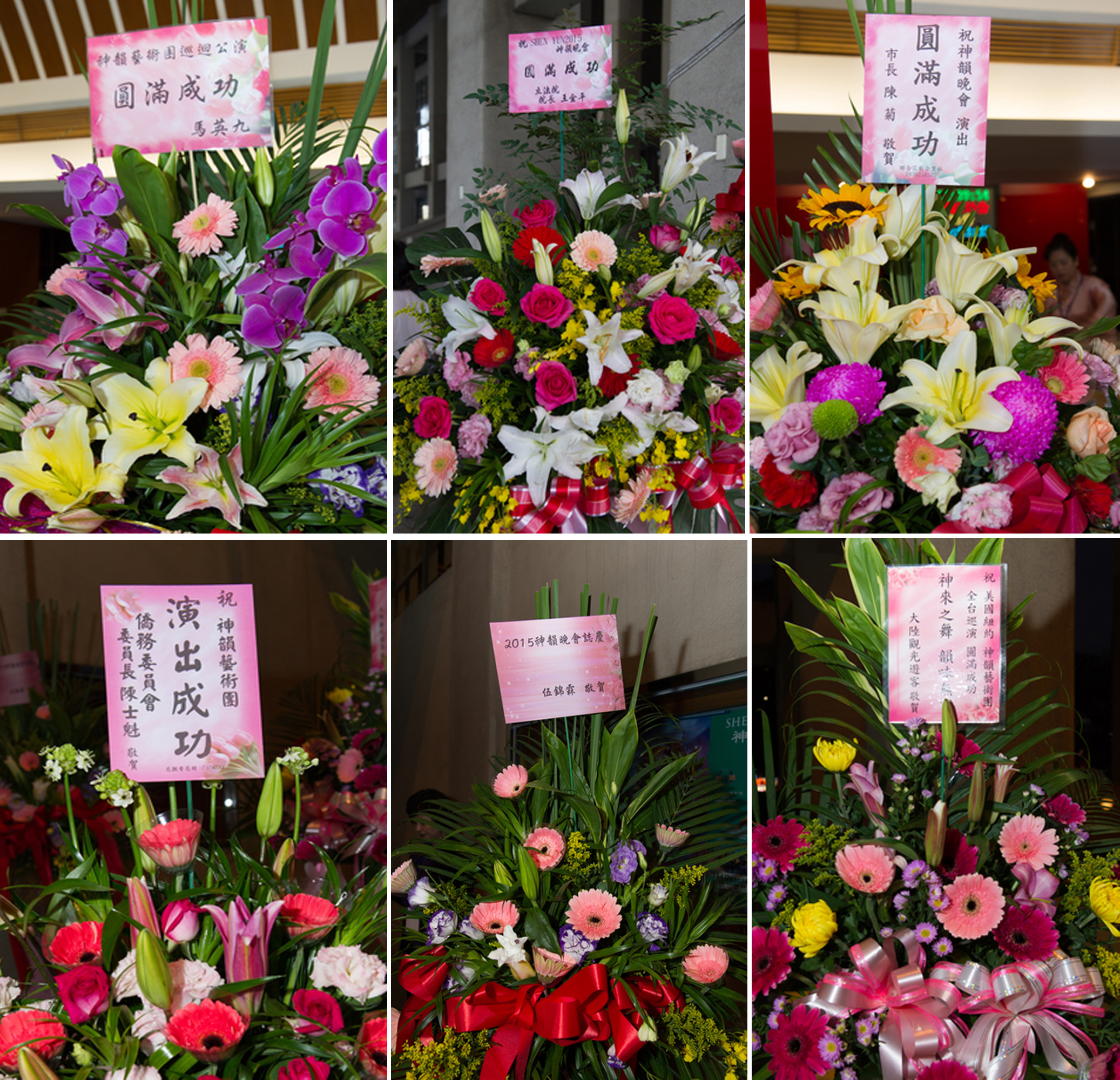 图2:台湾总统马英九和立法院院长王金平、高雄市长陈菊等多位政要致赠花篮,更有大陆游客也送来鲜花祝贺神韵在台湾演出“圆满成功”。 |