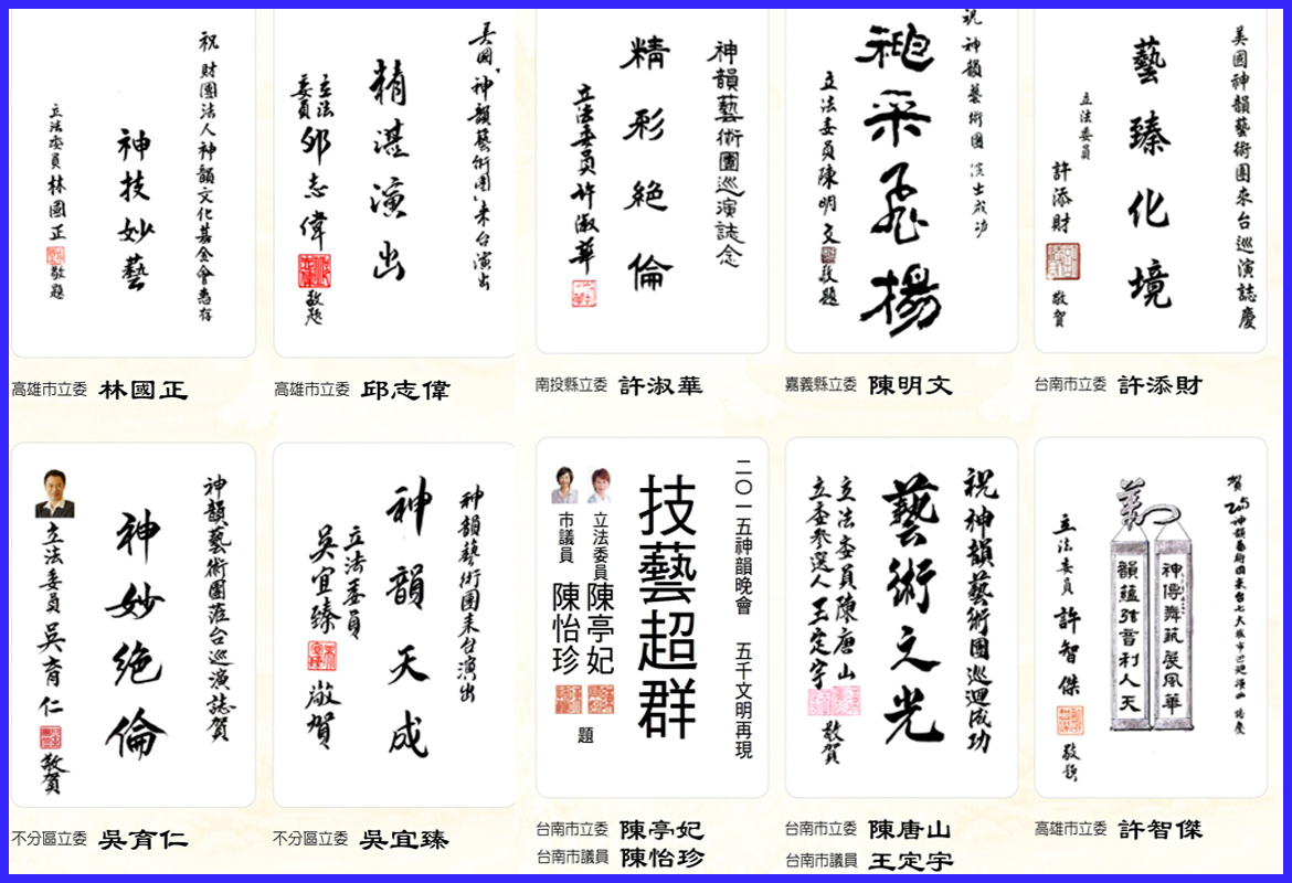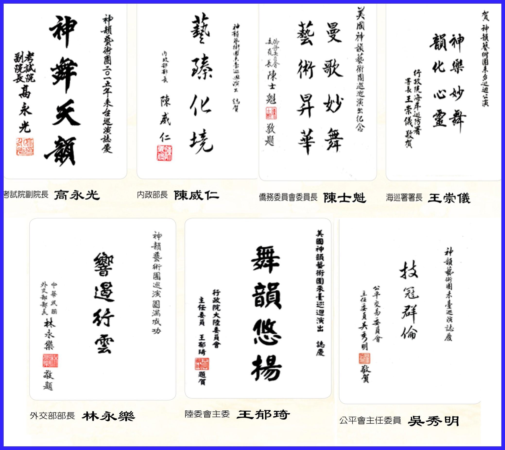 图3:台湾中央部会首长包括考试院副院长高永光、内政部长陈威仁、外交部长林永乐、前陆委会主委王郁琦等七位首长发文迎接神韵。 |
