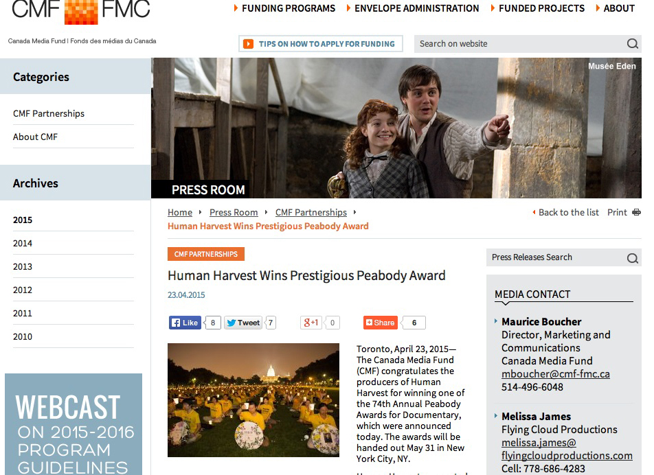 作为影片主要出资机构,加拿大媒体基金四月二十三日早上发布新闻公告,称赞纪录片《活摘》为加拿大赢得荣誉。  加拿大媒体基金四月二十三日早上发布新闻公告,宣布纪录片《活摘》获奖。 |