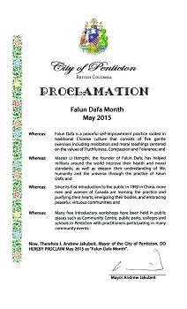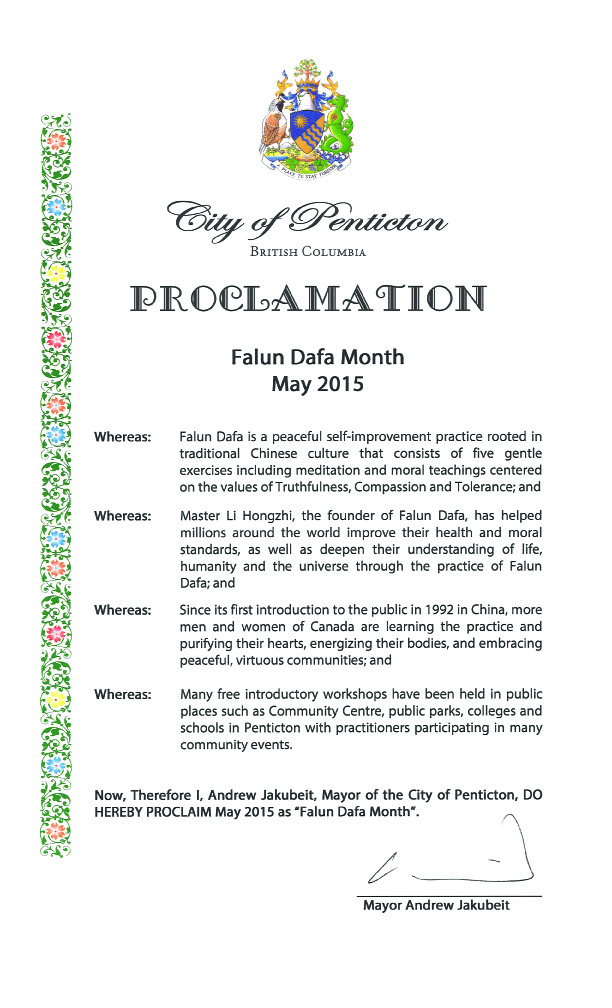 | 【明慧网二零一五年四月二十四日】加拿大不列颠哥伦比亚省潘提克顿市(City of Penticton)市长Andrew Jakubeit日前颁发褒奖状,宣布五月为“法轮大法月”。 褒奖信译文如下: 鉴于,法轮大法是根植于中国传统文化,一个和平的,自我提升与完善功法,他有五套包括打坐在内的缓慢炼功动作,以“真善忍”为价值观; 鉴于,法轮大法创始人,李洪志先生已经帮助全世界上亿民众,改善他们的健康,提升道德观念;通过修炼法轮大法更深的理解生命,宇宙和人体的关系; 鉴于,法轮大法自一九九二年在中国向公众传播,越来越多的加拿大民众在学炼功法,净化身心,增强体质,以创建更和平,良性的社区; 鉴于,法轮功学员在公共场所如社区中心,公园,学校和社区大学里开办免费介绍班,并参加多种社区活动; 所以我,Andrew Jakubeit,潘提克顿市市长,特此宣布二零一五年五月为“法轮大法月”。