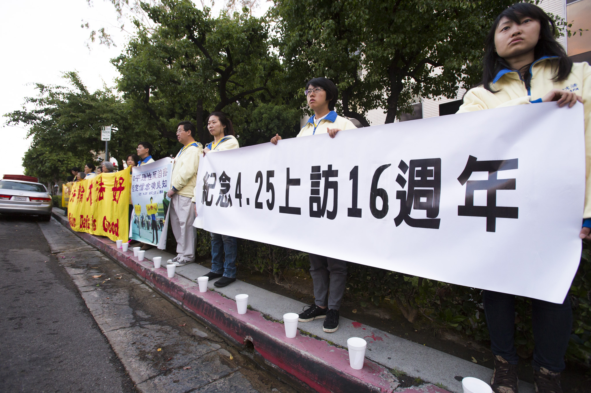 【明慧网二零一五年四月二十九日】一九九九年四月二十五日,逾万名法轮功学员为争取合法的炼功权利与信仰自由到中南海上访,其规模与上访者的和平理性震惊了世界。二零一五年四月二十五晚间,和往年一样,数百名法轮功学员聚集在洛杉矶中领馆前,烛光纪念十六年前的这一天。 图:数百名法轮功学员聚集在洛杉矶中领馆前,烛光纪念十六年前的这一天。 |