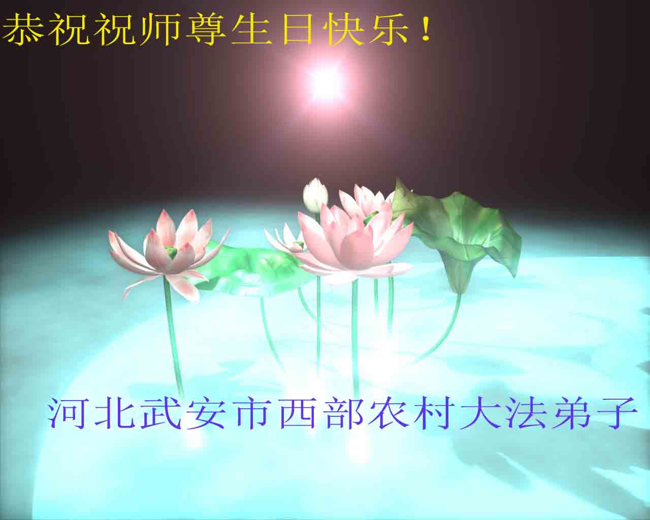 祝师父生日快乐! 请师父放心。我们一定在这最后的时间里,不管邪恶怎么叫嚣,都紧跟师父做好大法弟子该做的事,随时把家还。 河北省衡水市冀州市全体大法弟子祝慈悲伟大的师尊生日快乐!