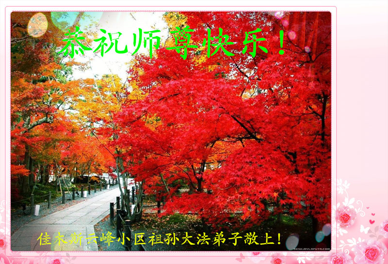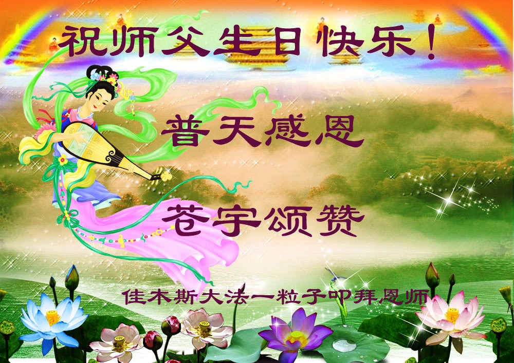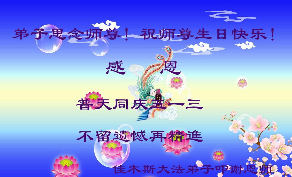 感谢师尊与大法的救度之恩!弟子在今后的日子里一定要做好三件事,肩负起自己的责任,请师尊放心。 黑龙江省佳木斯大法弟子恭祝伟大的师尊生日快乐!庆祝世界法轮大法日!