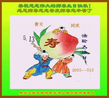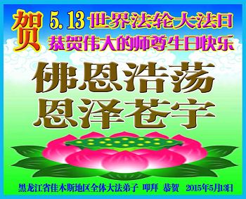 师尊传法 福满中华 亿万弟子 德盈天下 修炼无价 生命升华 思维开阔 目标远大 兑现誓约 助师正法 广救众生 拯救中华 感谢师尊 感谢大法 祝师快乐 永听师话 佳木斯大法弟子 2015.4.27 黑龙江省佳木斯大法弟子恭祝伟大师尊生日快乐!
