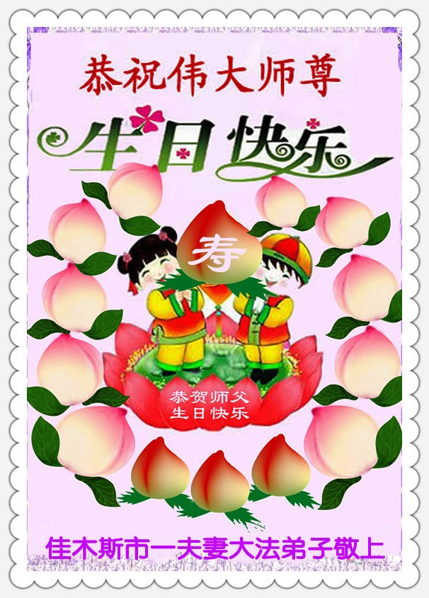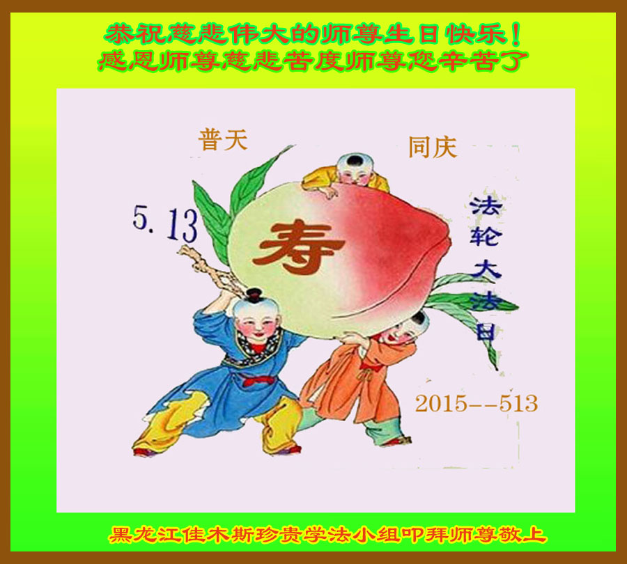 师尊慈悲 佛恩浩荡 济世大法 宇宙洪扬 一部天书 闪耀佛光 法正天地 共铸辉煌 大法弟子 心怀坦荡 助师正法 讲清真相 人神得救 法船开航 祝师快乐 叩首圣王 黑龙江省佳木斯三人学法小组恭祝伟大的师尊生日快乐!庆祝世界法轮大法日!