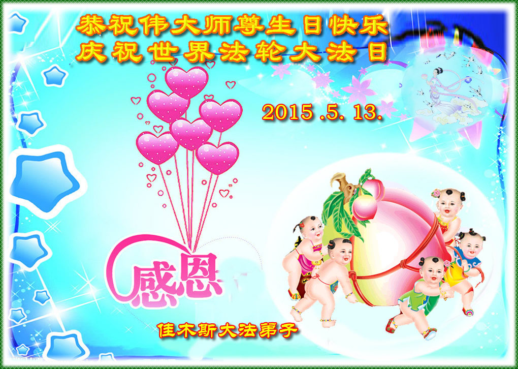 庆祝世界法轮大法日 学法修心 理智清醒 信师信法 意志坚定 排除干扰 正念正行 助师正法 完成使命 救度众生 福音传送 遇事内找 不断提升 兑现誓约 重返天庭 师尊快乐!伟大英明 佳木斯大法弟子 2015年5月1日 黑龙江佳木斯市大法弟子恭祝师父生日快乐!