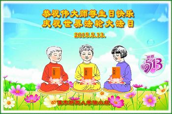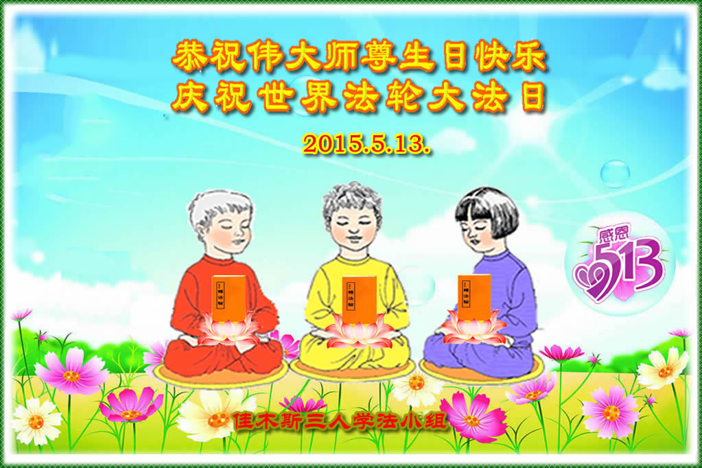 庆祝世界法轮大法日 宇宙在欢歌, 人神很喜悦。 感恩五一三, 欢庆大法节。 祝师永快乐! 敬师叩首谢。 大法正乾坤, 开创新世界。 牢记师教导, 三事不松懈。 大法用心学, 正念邪恶灭。 认真讲真相, 救人很迫切。 兑现史前约, 神路朝前越。 佳木斯大法弟子 2015年5月1日 黑龙江省佳木斯大法弟子全球同贺“五•一三”世界法轮大法日!