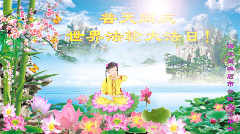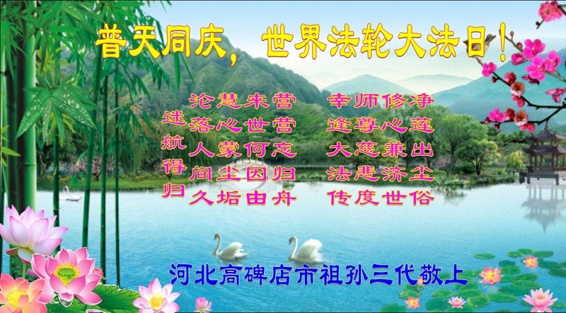 同庆法轮大法洪传二十三周年! 在宇宙正法的最后时刻,弟子们一定牢记师尊的教诲,肩负起救度众生的责任与使命,兑现洪愿、兑现誓约,圆满随师还。 河北保定北市区大法弟子恭祝慈悲伟大的师尊生日快乐!