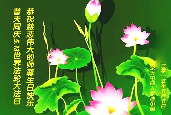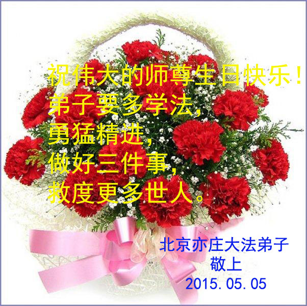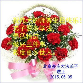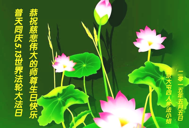 【明慧网二零一五年五月十日】 北京大法弟子恭祝师尊节日愉快!庆祝世界法轮大法日!