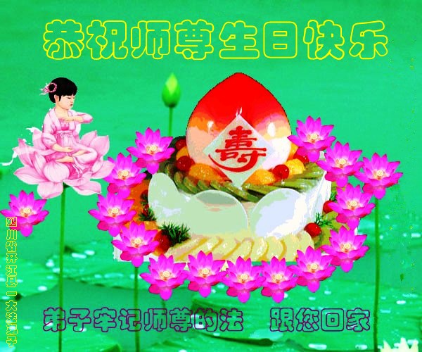 慈悲伟大的师尊好!师父辛苦了! 在这普天同庆同贺同祝的日子里,我们学法小组全体大法弟子恭祝师父生日快乐暨5.13世界法轮大法日!庆祝师父传法二十三周年!谢谢师父的慈悲救度!唯有做好三件事,学好法,扎扎实实修好自己,遇事无条件向内找,圆容好整体,在法中升华提高自己,精進、精進、再精進,做到百分之百信师信法,做一个合格的正法时期大法弟子,跟师父回家。 四川遂宁一大法弟子跪拜恭祝慈悲伟大的师尊生日快乐!普天同庆同贺5.13世界法轮大法日!