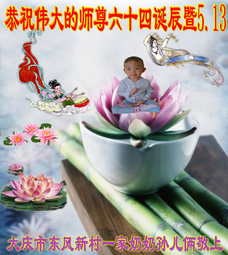 黑龙江省大庆东风新村一家奶奶孙儿俩恭祝师尊华诞暨世界法轮大法日!