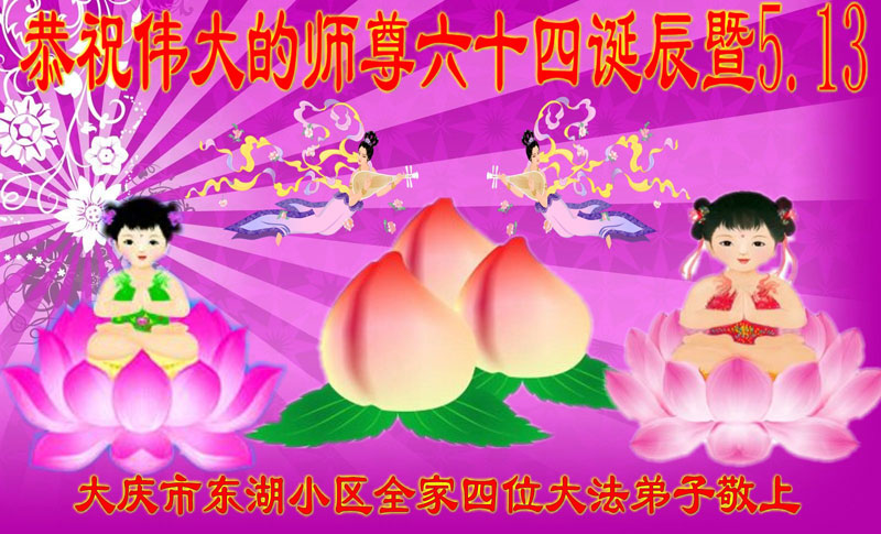 黑龙江省大庆东湖小区全家四位大法弟子恭祝师尊华诞暨世界法轮大法日!