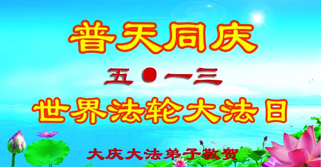 欢庆世界法轮大法日 普天同庆大法日五一三 是师尊开始传法那一天 得法的学员就有千千万 师尊的慈悲心洪大无边 想把所有法徒都度回天 我要象金刚一样意志坚 放下一切执着把事看淡 溶于法中做事都是用善 学好法提高心性是关键 精進实修不能留下遗憾 徒儿敬拜师尊浩荡洪恩 千言万语表达不了心愿 救度世人劝三:退.脚别闲 大法弟子得把誓约兑现 退出党团队的超过两亿 迎接即将到来法正人间 黑龙江省大庆东湖全体大法弟子恭祝师尊华诞暨世界法轮大法日!