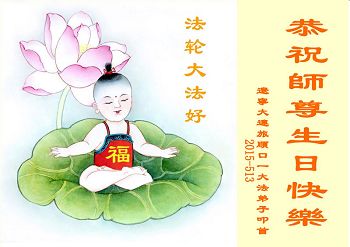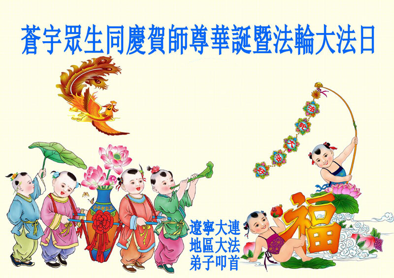 在这普天同庆法轮大法洪传二十三周年的喜庆日子里,我们更加感恩师尊的慈悲救度!是慈悲伟大的师尊把我们从地狱中捞起、洗净,把伟大的佛法赐给我们,才有了我们今天万古难遇的修炼机缘和生命的希望,我们幸运能够在大法洪传时得人身、生东土,我们一定珍惜这万古机缘,听师尊的话,按照法轮大法的要求,精進实修,做好三件事,跟师尊回家。 辽宁省大连市西岗区大法弟子敬祝师父生日好!同祝世界法轮大法日!