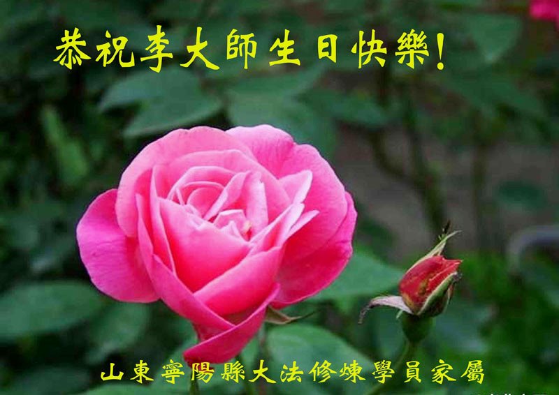 至尊至上的李大师,您好! 我们感谢您的慈悲救度,感谢您无量慈悲,在人类的历史走到尽头时,洪传真善忍高德大法。沐浴在佛光中,人们善良的本性在复苏,他们知道了怎样活着更有意义,不再去做违背良心的事,得救的生命无不感恩慈悲伟大的李大师!我们都祈盼着李大师早日回归故国,聆听您的慈悲教诲。 跪谢李大师! 山东省泰安市宁阳县大法修炼学员家属恭贺李大师华诞暨世界法轮大法日!