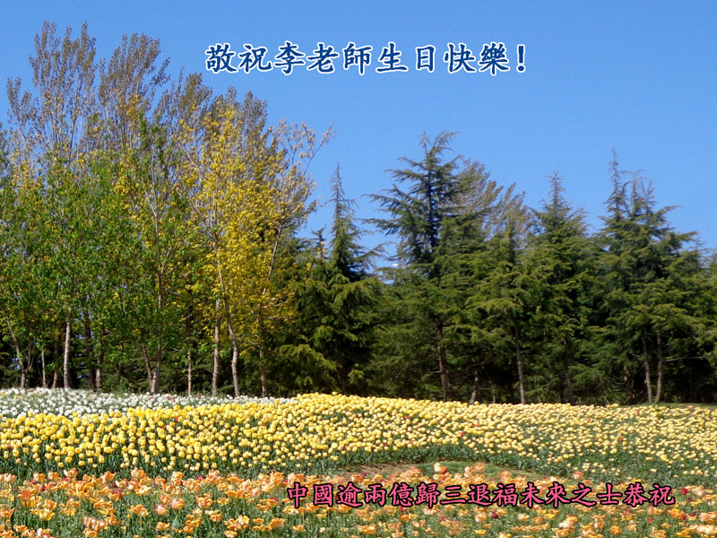 山东烟台开发区大法弟子的老伴部队转业干部早已退出中共邪*党-,支持法轮功。在普天同庆世界法轮大法日之时,恭祝李大师生日快乐! 四川省南充全体大法弟子及明真相的亲朋恭祝无量慈悲伟大的师尊生日快乐!普天同庆同贺五•一三法轮大法日暨大法洪传二十三周年!
