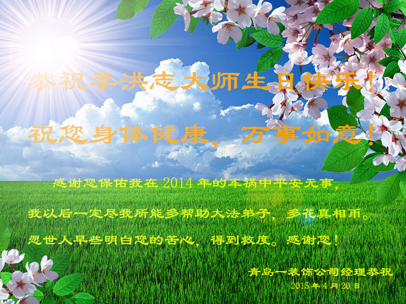 尊敬的李大师,您好!我们不知道用什么语言,来表达我们心中的无限感恩与万分敬仰!我们感谢一个个法轮大法修炼者,是他们无私无我的高贵品行,遇事首先为别人着想的无私境界,感召着每一个有良知的生命,使他们免于成为中共邪*党-的陪葬品。天灭中共已是定局,希望深受其害的人们,赶快“三:退.”保平安,共同迎接大审判的那一天!得救的生命跪谢慈悲伟大的李大师! 山东省青岛一装饰公司经理恭祝李大师生日快乐!