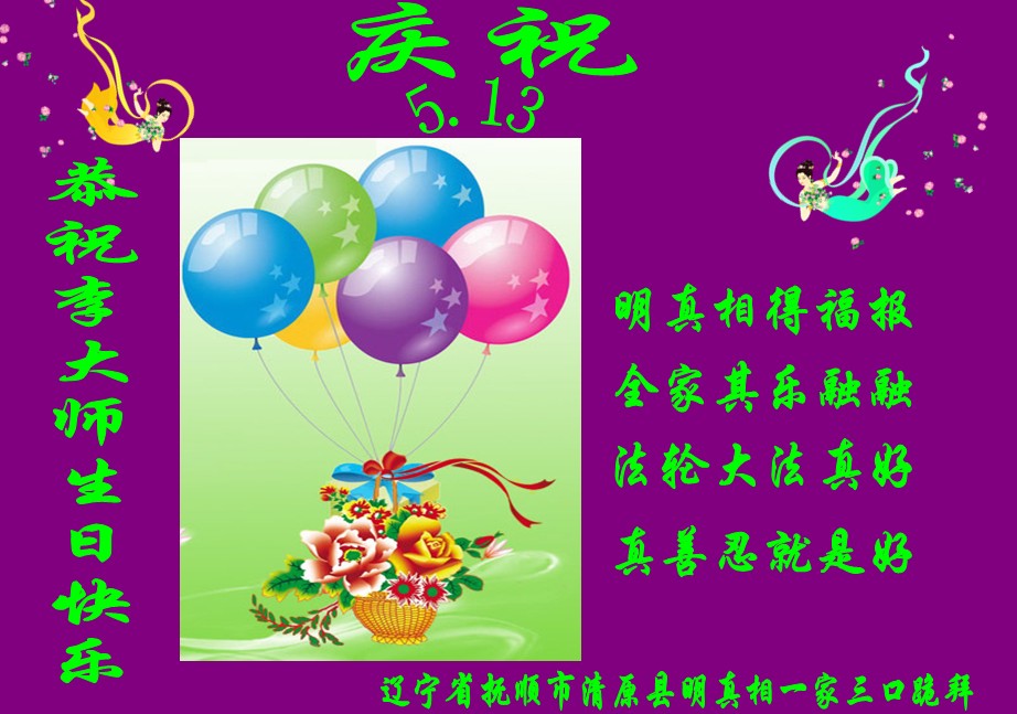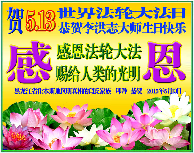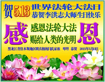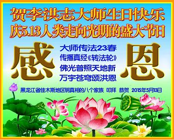 【明慧网二零一五年五月十日】 黑龙江省佳木斯地区明真相的闫氏家族恭贺李大师生日快乐!贺世界法轮大法日!
