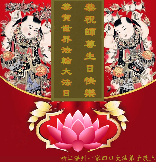法正乾坤 师尊慈悲 修己救人 弟子精進 法正人间 众生感恩 浙江温州一家四口大法弟子恭祝师尊生日快乐!暨恭贺世界法轮大法日!