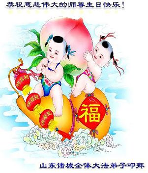 经历了十几年的风风雨雨,无不在师尊的慈悲呵护之下,同时也暴露出了很多执着心,在这最后不多的时间里,我们一定修好自己,做好三件事,报答师尊的慈悲苦度。 山东省潍坊大法弟子祝师父生日快乐!