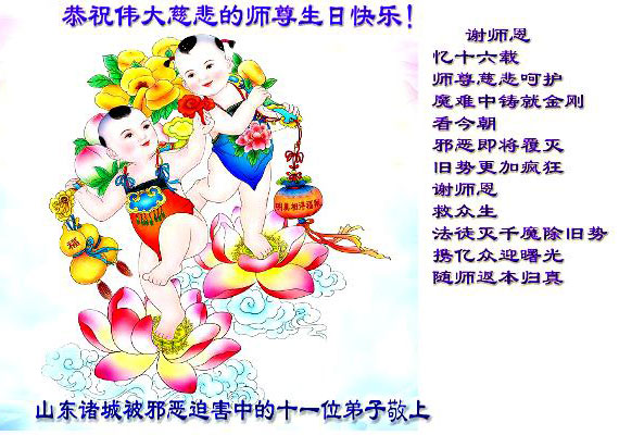 山东省潍坊市诸城市被邪恶迫害中的十一位大法弟子恭祝师尊生日快乐!